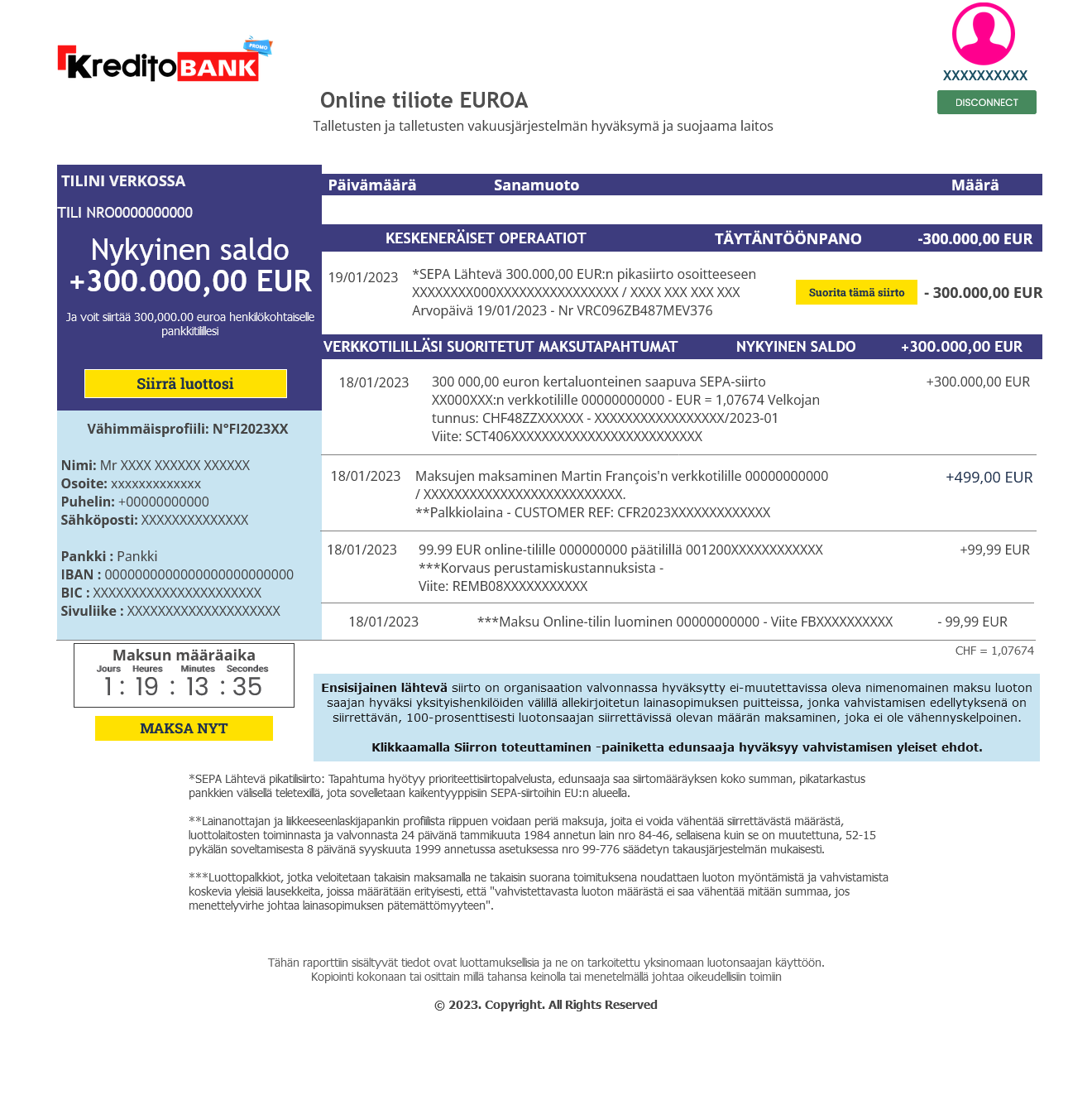 Muistutus - Heti kun olet allekirjoittanut sopimuksen, saat tunnukset, joilla voit siirtää varat suoraan verkossa henkilökohtaiselle pankkitilillesi. Lainanottajan ja liikkeeseenlaskijapankin profiilista riippuen voidaan periä maksuja, joita ei voida vähentää siirrettävästä määrästä